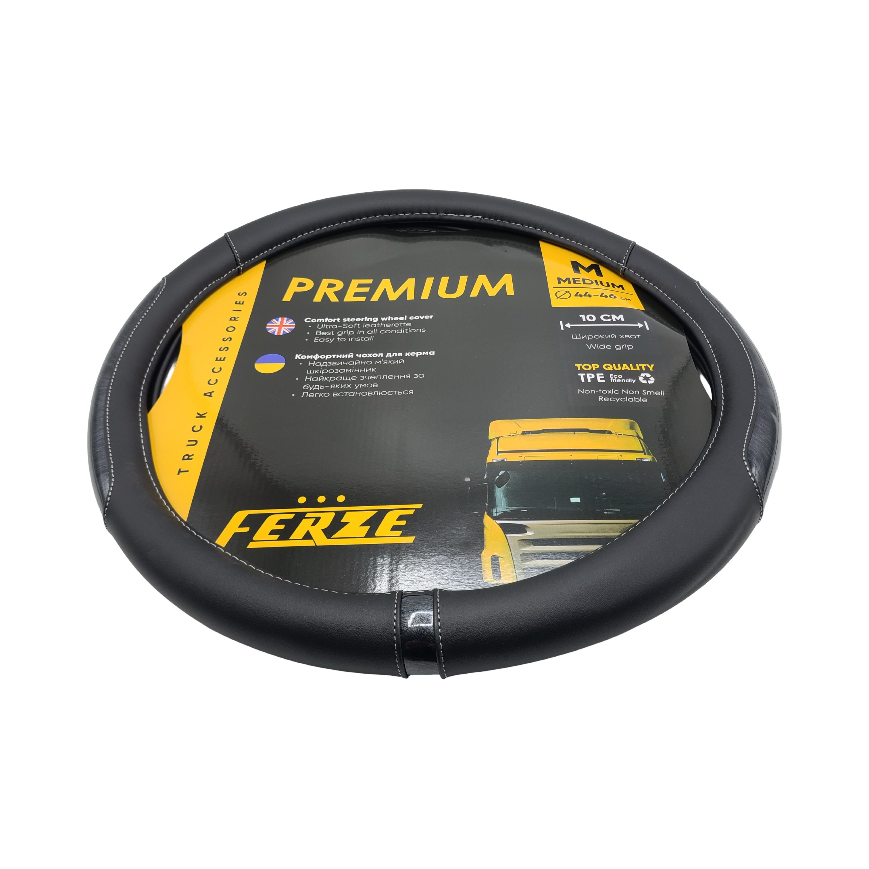 Чехол на руль из эко-кожи с чёрными вставками 440–460 мм предназначен для грузовых автомобилей, автобусов и коммерческого транспорта. Стильный дизайн с контрастными вставками подчёркивает интерьер салона и придаёт ему аккуратный современный вид.